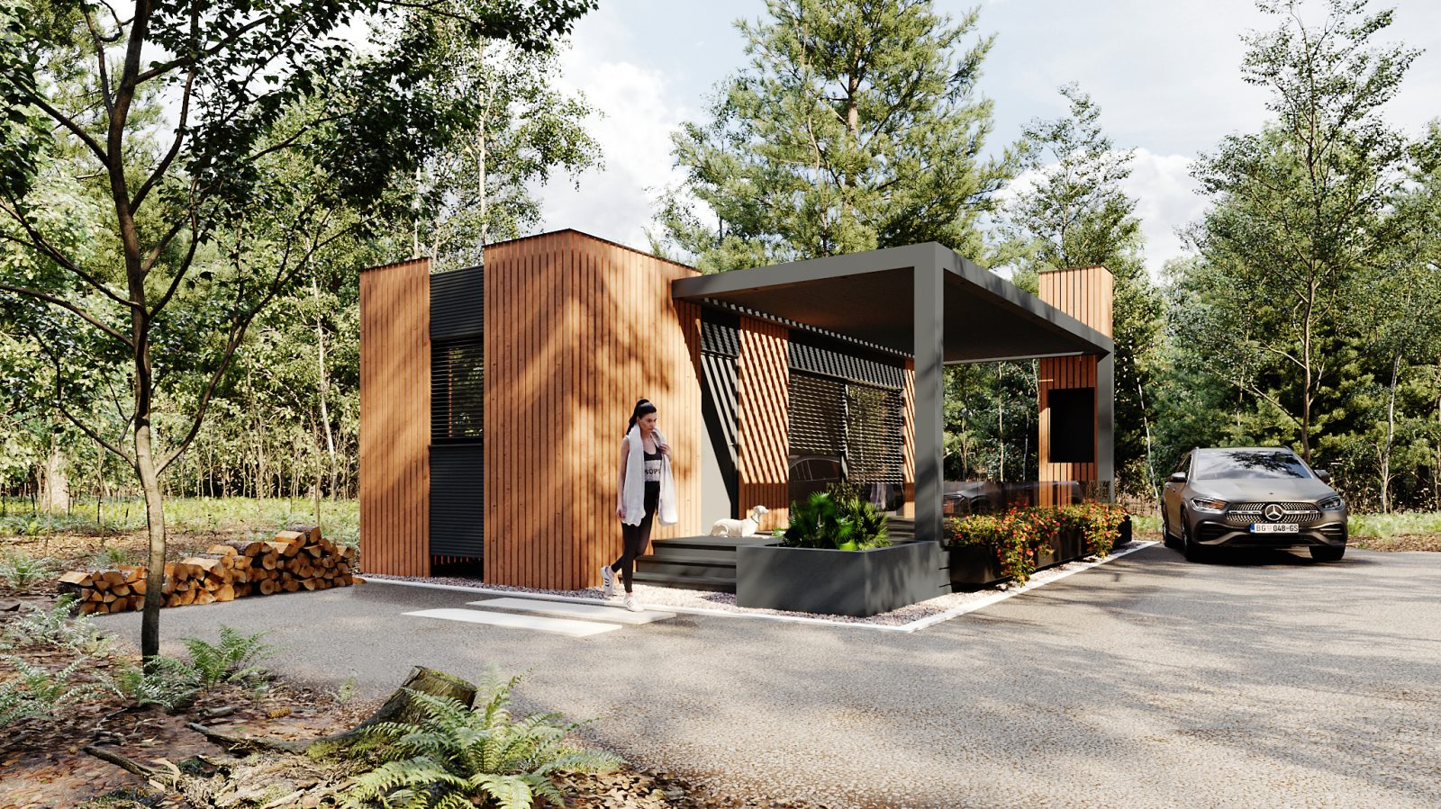 Nadstrešnica dimenzija 7,5x3 m, u aluminijumskoj konstrukciji sa fiksnom ispunom od drvenih talpi. U kompletu sa nadstrešnicom je i kućište za roštilj dimenzije 90x60 cm sa napom od nerđajućeg čeličnog lima, obložen drvenim fasadnim dekorom.
